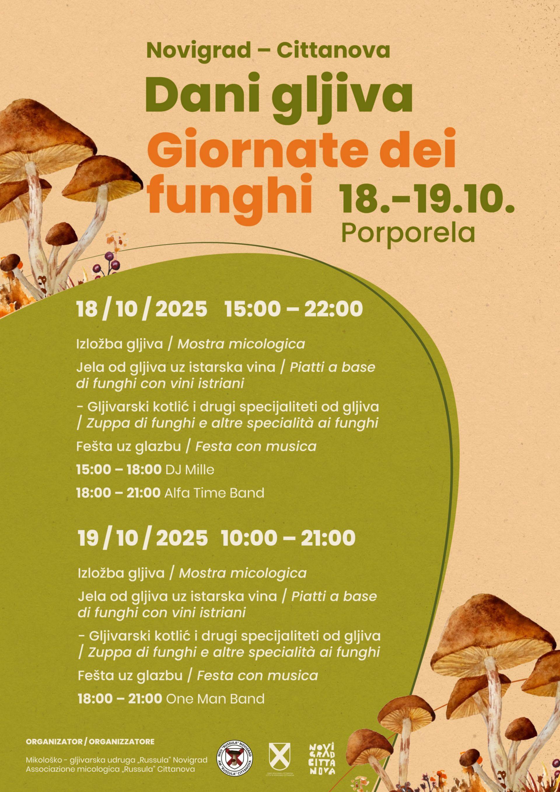 Na Danima gljiva očekuje vas bogata izložba gljiva u organizaciji Mikološko-gljivarske udruge „Russula“ Novigrad, gdje ćete moći upoznati raznoliki svijet istarskih gljiva. Gastro dio donosi maštovita jela od gljiva i neizostavni gljivarski kotlić u kombinaciji s istarskim vinima, a sve uz opuštenu atmosferu i zabavni program na toplome, u šatoru.